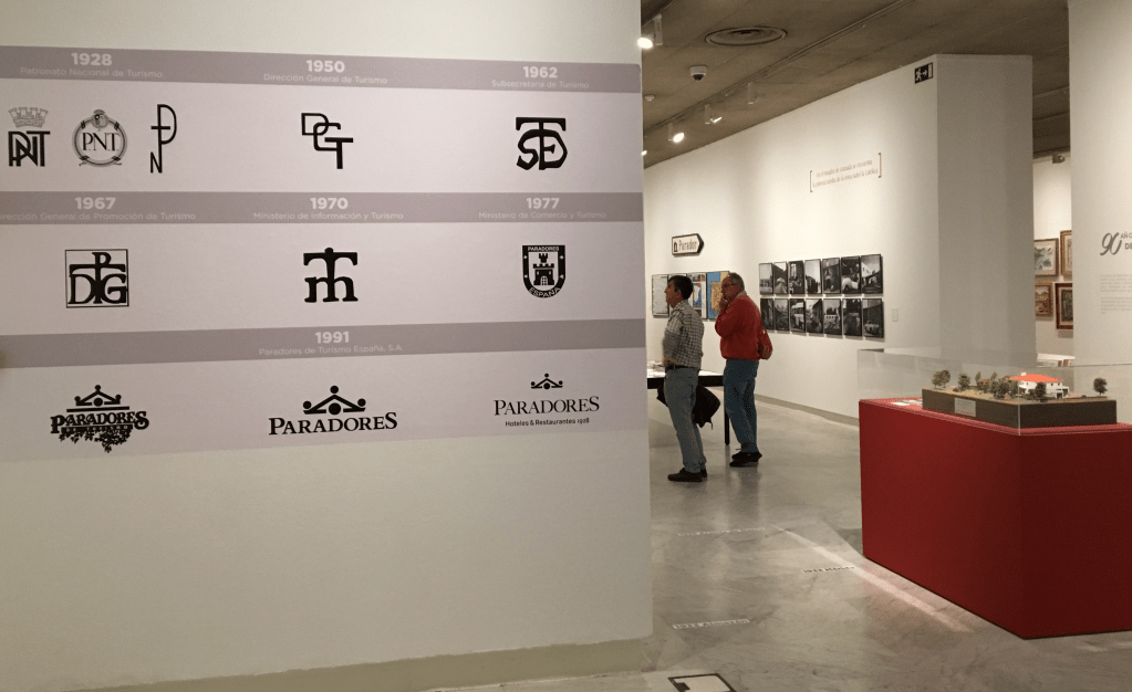 Al entrar a la exposición nos recibió el mural de la imagen, que mostraba la identidad gráfica de Paradores a lo largo de la historia.