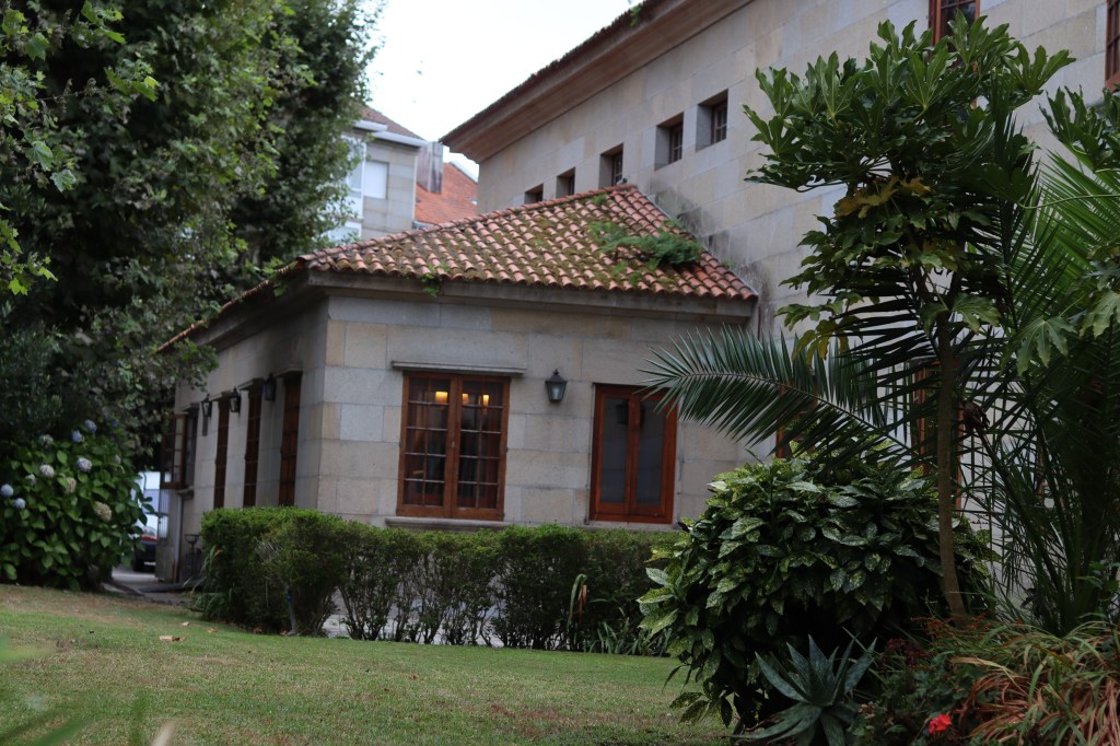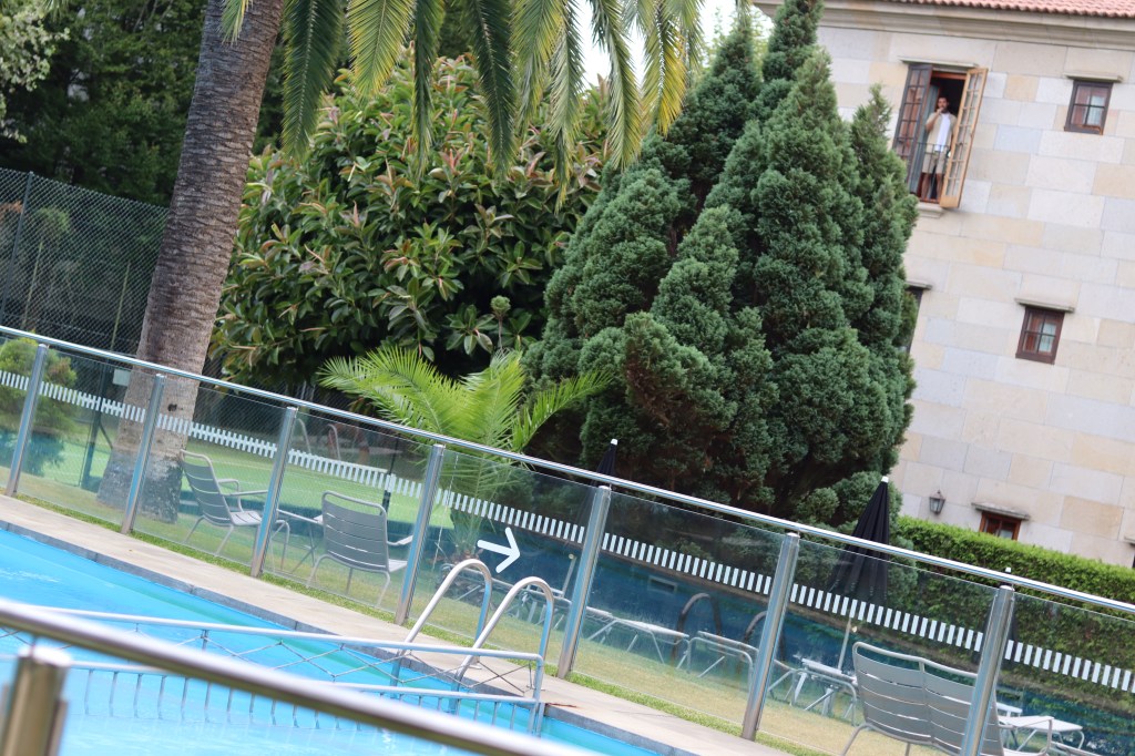 Cuenta con un estupendo y amplio jardín y una piscina de la que se puede disfrutar en verano si el tiempo gallego acompaña, aunque no fue el caso. Sin duda uno de los espacios más destacables del Parador es el patio interior alrededor del cual se articulan el resto, que, también debido a su cuidada decoración, genera un ambiente de lo más acogedor.
