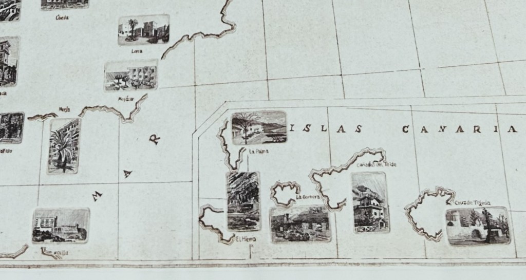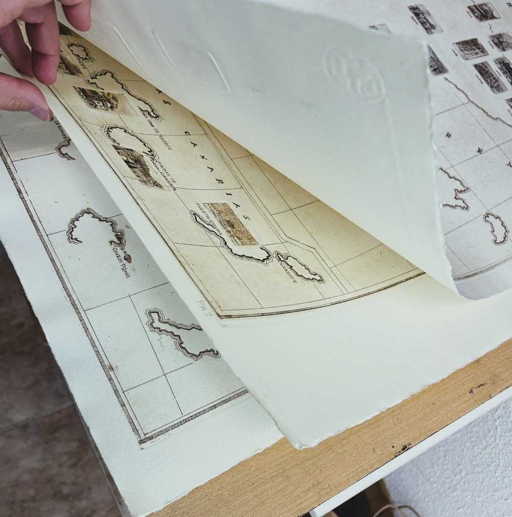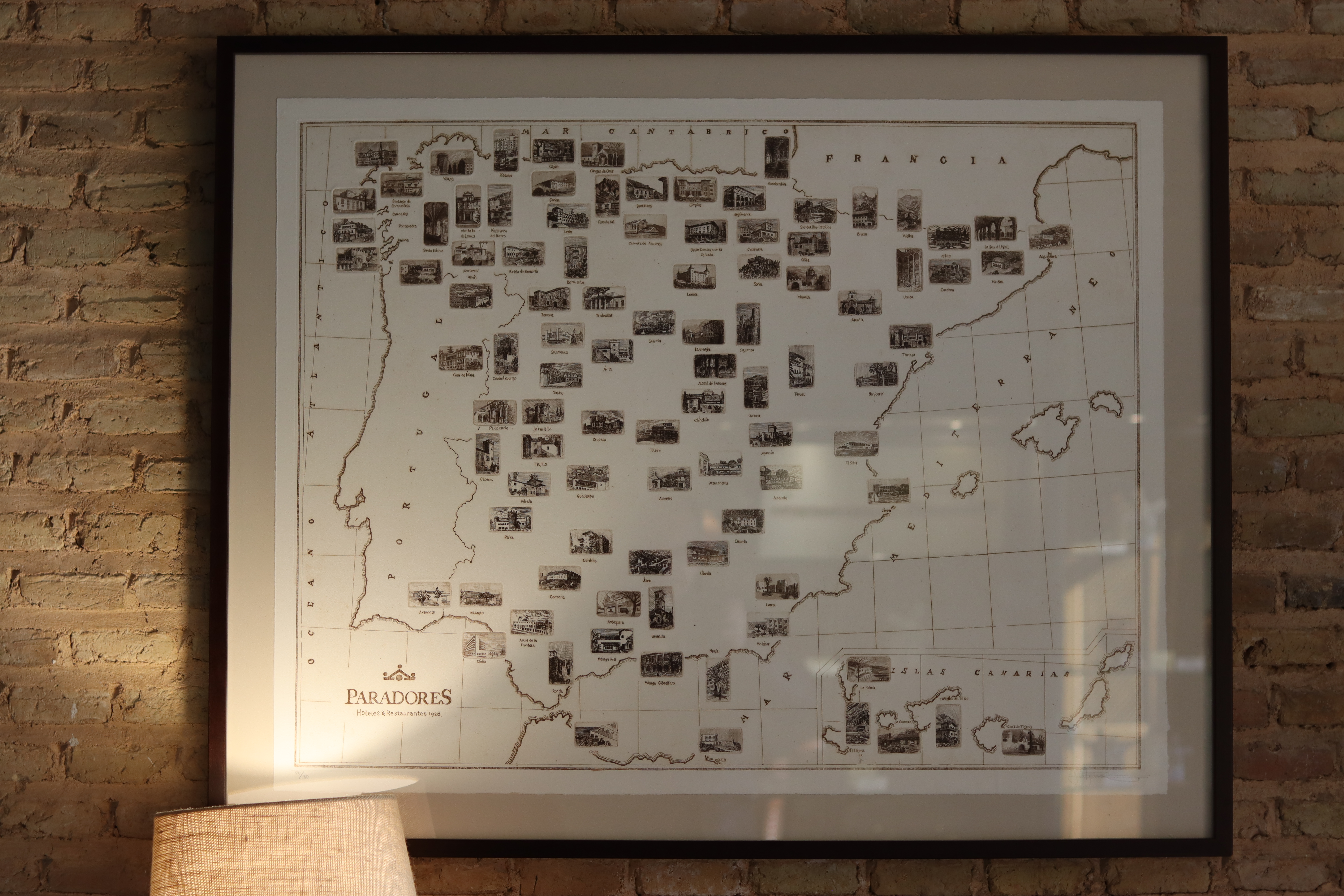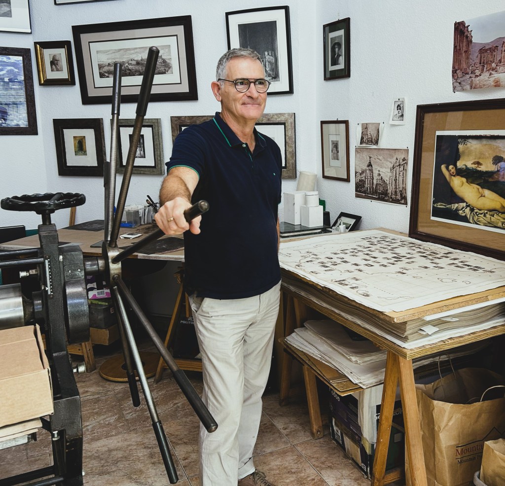 Javier nos cuenta con orgullo que el mapa de Paradores es una obra muy compleja, y que costó mucho trabajo hacer. Y es que el mapa está configurado como una suerte de puzzle sobre el que superponen nada menos que el casi centenar de grabados de cada uno de los Paradores de España que existen en la actualidad. El trabajo, claro está, no es solo la composición, que ya de por sí es compleja, sino la realización de cada una de las planchas, en negativo, que luego se estampan individualmente sobre el mapa con ayuda del tórculo.