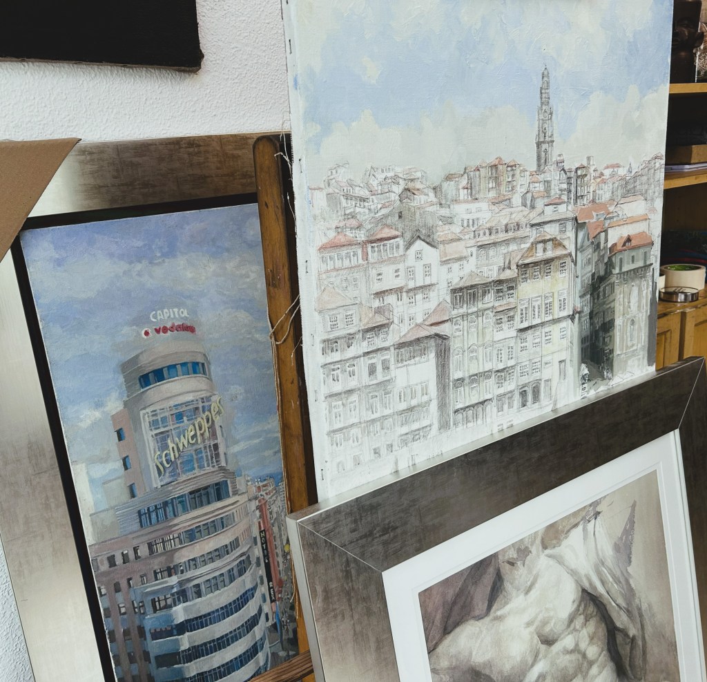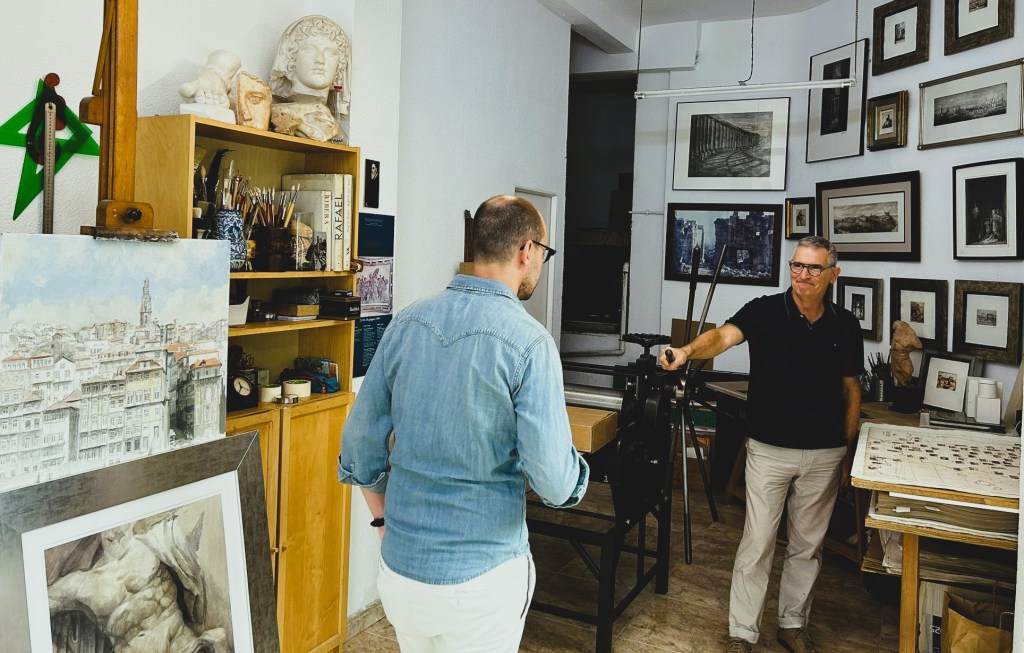 El estudio de Javier, donde nace toda la magia del mapa, es un pequeño rincón madrileño donde el artista crea y almacena parte de su obra, que no se reduce solo al grabado. De hecho, Javier nos habla con pasión de su faceta de pintor y de cómo la pintura es para él tan importante como lo es el grabado. Íbamos con el foco puesto en el mapa, pero no se nos escaparon ni los grabados ni las pinturas que pueblan el estudio.